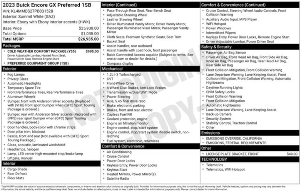 Fox Chevrolet has been delivering on a promise since 1967. Come in and check out what the Fox Advantage truly is. Same Vehicle, Same Color, Same Options- Better Value. We do the legwork for you! We use state-of-the-art software to make sure our vehicles are priced below the market. This ensures you a great value, a stress-free and fun buying experience. As part of the Fox family, all of our customers receive a Deductible Reimbursement program that could save you thousands, just ask us how! FWD 2023 Buick Encore GX Preferred ECOTEC 1.2L Turbo