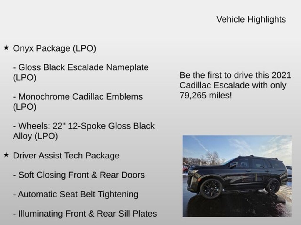 Recent Arrival! New Price! Clean CARFAX. CARFAX One-Owner. 8-Way Power Driver Seat Adjuster, 8-Way Power Front Passenger Seat Adjuster, Adaptive Cruise Control, Air Ride Adaptive Suspension, AKG Studio Reference 36-Speaker Audio System, Automatic Seat Belt Tightening, Driver Assist Tech Package, Enhanced Automatic Emergency Braking, Front dual zone A/C, Gloss Black Escalade Nameplate (LPO), Heads-Up Display, Heated front seats, Heated rear seats, Illuminating Front & Rear Sill Plates, Memory seat, Monochrome Cadillac Emblems (LPO), Onyx Package (LPO), Power Liftgate, Power moonroof, Reverse Automatic Braking, Soft Closing Front & Rear Doors, Ventilated front seats, Wheels: 22" 12-Spoke Gloss Black Alloy (LPO).
