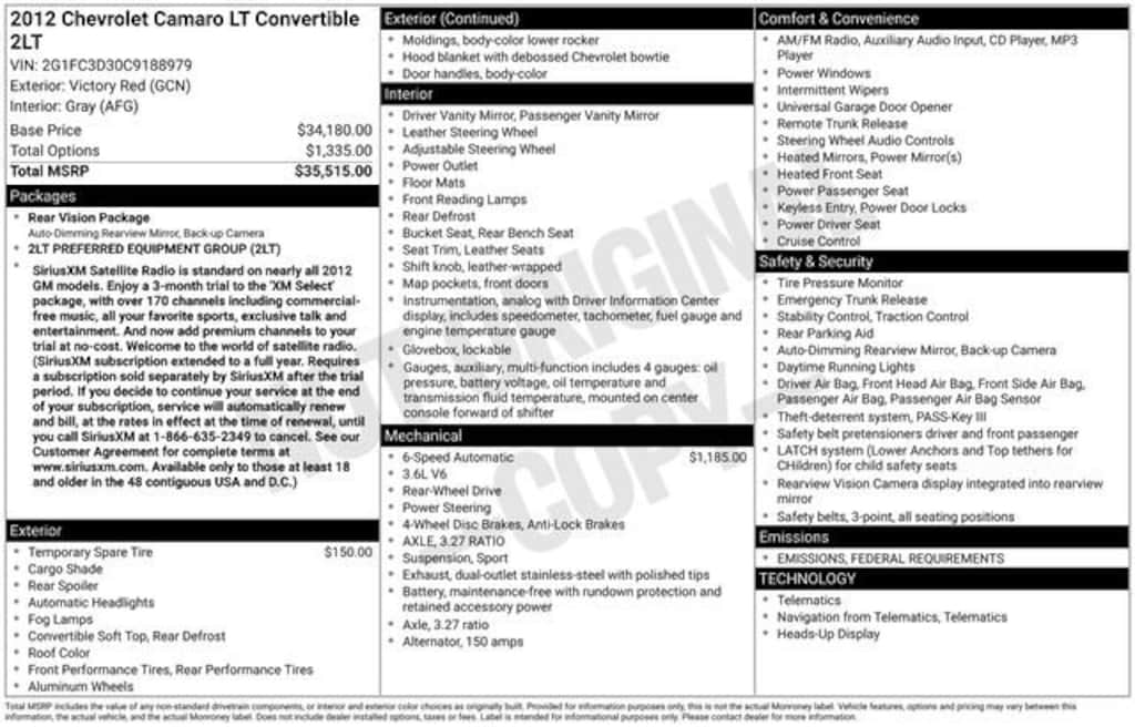 !!NEW ARRIVAL!! MORE PICTURES COMING.This vehicle was just added to our inventory and is in the process of being inspected and reconditioned; the optioned listed might not be complete and are subject to change. Please call or click the link on this page to request more information. Donât miss out contact us today!! Camaro 2LT 2LT, 2D Convertible. Clean CARFAX. CARFAX One-Owner. Odometer is 25485 miles below market average!18/29 City/Highway MPGAwards:* JD Power Dependability Study * 2012 KBB.com 10 Best Road Trip Convertibles * 2012 KBB.com Best Resale Value AwardsFox Chevrolet has been delivering on a promise since 1967. Come in and check out what the Fox Advantage truly is. Same Vehicle, Same Color, Same Options- Better Value. We do the legwork for you! We use state-of-the-art software to make sure our vehicles are priced below the market. This ensures you a great value, a stress-free and fun buying experience. As part of the Fox family, all of our customers receive a Deductible Reimbursement program that could save you thousands, just ask us how! RWD 2012 Chevrolet Camaro 2LT 2LT 3.6L V6 DGI DOHC VVT