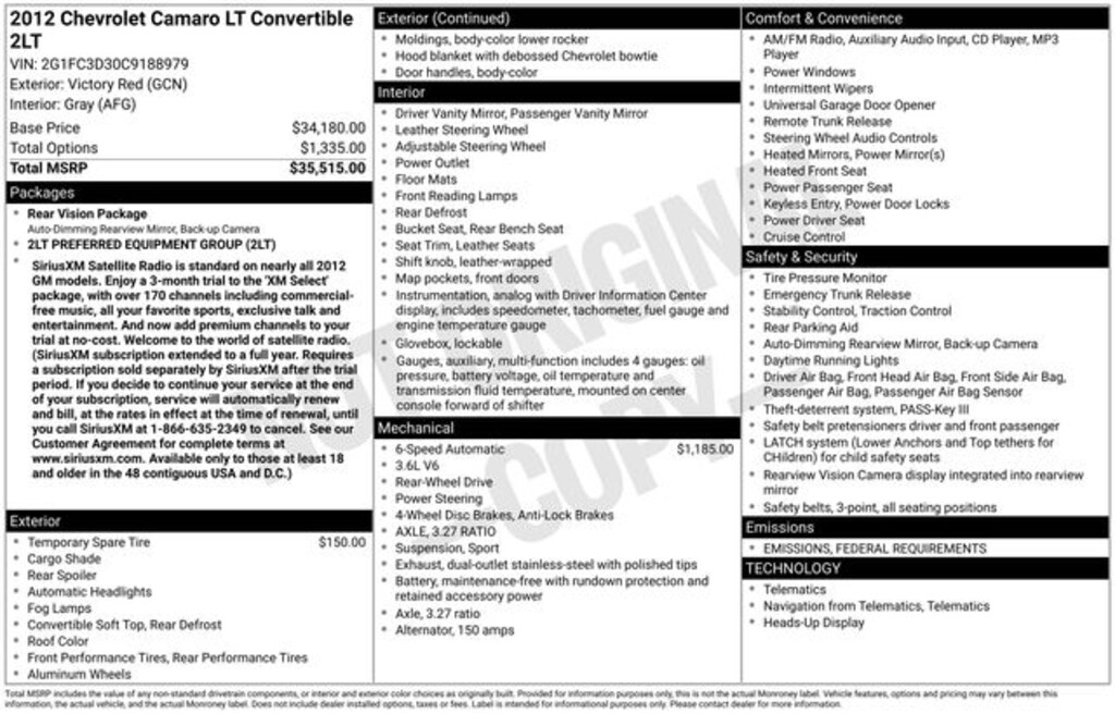 Fox Chevrolet has been delivering on a promise since 1967. Come in and check out what the Fox Advantage truly is. Same Vehicle, Same Color, Same Options- Better Value. We do the legwork for you! We use state-of-the-art software to make sure our vehicles are priced below the market. This ensures you a great value, a stress-free and fun buying experience. As part of the Fox family, all of our customers receive a Deductible Reimbursement program that could save you thousands, just ask us how! RWD 2012 Chevrolet Camaro 2LT 2LT 3.6L V6 DGI DOHC VVT