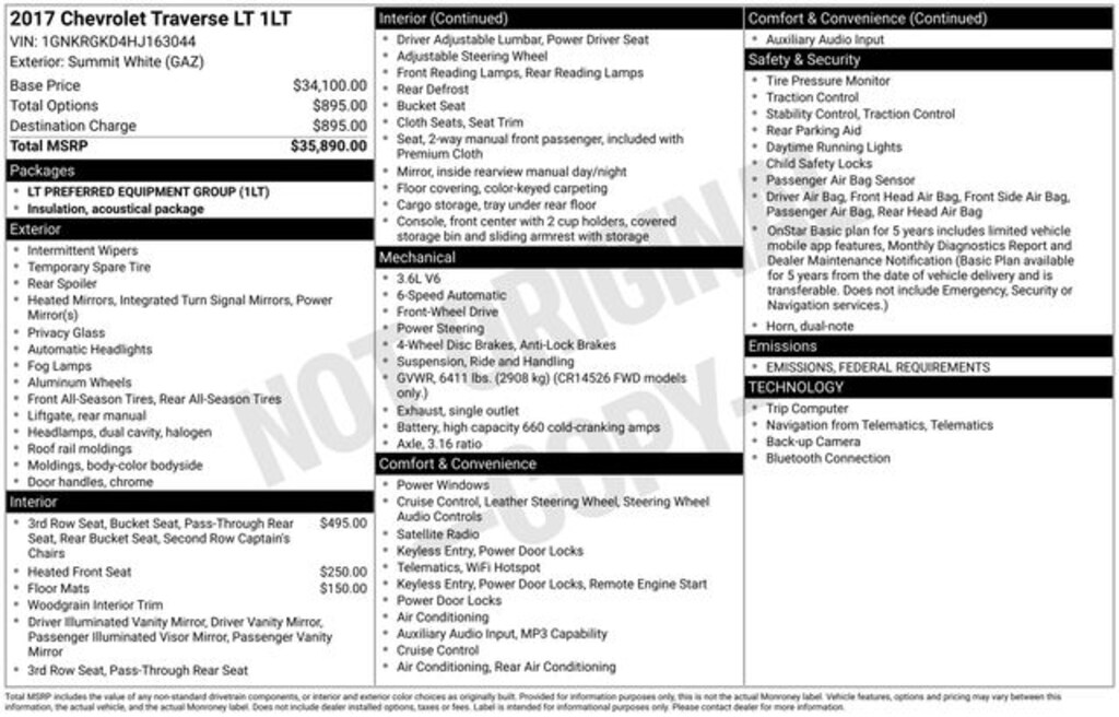 Fox Chevrolet has been delivering on a promise since 1967. Come in and check out what the Fox Advantage truly is. Same Vehicle, Same Color, Same Options- Better Value. We do the legwork for you! We use state-of-the-art software to make sure our vehicles are priced below the market. This ensures you a great value, a stress-free and fun buying experience. As part of the Fox family, all of our customers receive a Deductible Reimbursement program that could save you thousands, just ask us how! FWD 2017 Chevrolet Traverse LT 1LT 3.6L V6 SIDI