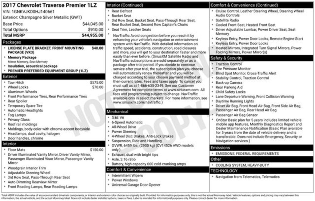 Fox Chevrolet has been delivering on a promise since 1967. Come in and check out what the Fox Advantage truly is. Same Vehicle, Same Color, Same Options- Better Value. We do the legwork for you! We use state-of-the-art software to make sure our vehicles are priced below the market. This ensures you a great value, a stress-free and fun buying experience. As part of the Fox family, all of our customers receive a Deductible Reimbursement program that could save you thousands, just ask us how! AWD 2017 Chevrolet Traverse Premier 3.6L V6 SIDI