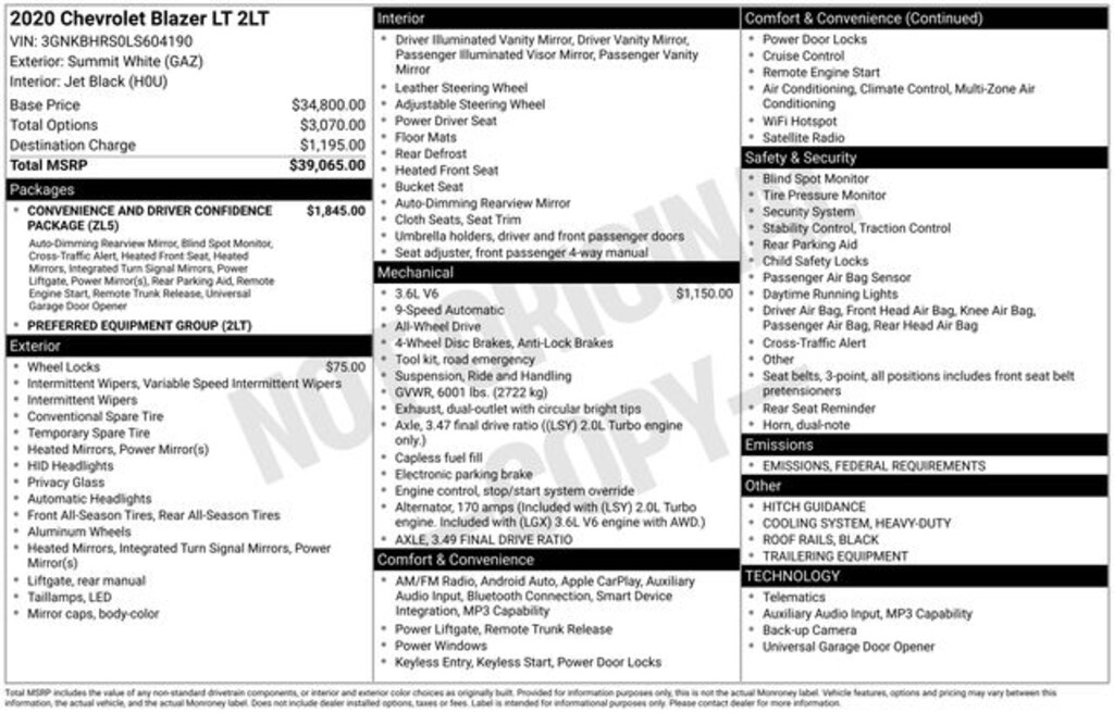 Fox Chevrolet has been delivering on a promise since 1967. Come in and check out what the Fox Advantage truly is. Same Vehicle, Same Color, Same Options- Better Value. We do the legwork for you! We use state-of-the-art software to make sure our vehicles are priced below the market. This ensures you a great value, a stress-free and fun buying experience. As part of the Fox family, all of our customers receive a Deductible Reimbursement program that could save you thousands, just ask us how! AWD 2020 Chevrolet Blazer LT 3.6L V6 SIDI DOHC VVT