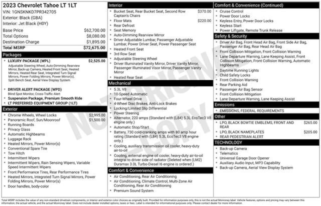 Fresh on the market! This well-maintained vehicle has just been listed, and photos are on the way.This 2023 Chevrolet Tahoe LT is packed with premium features that will elevate your driving experience. Highlights include: 22 Multi-Spoke Gloss Black Wheels (LPO) Luxury Package Dual-Pane Power Panoramic Sunroof Heated Power-Folding Mirrors HD Surround Vision Heated Steering Wheel Power Tilt & Telescopic Steering Column Rear Pedestrian Alert Power Release 2nd Row Seats Heated 2nd Row Outboard SeatsWith its powerful EcoTec3 5.3L V8 engine and 4-wheel drive, this Tahoe LT delivers impressive capability and performance. Enjoy impressive fuel efficiency, with an EPA-estimated 15 city/20 highway MPG.The spacious interior offers seating for up to 8, with premium leather-appointed upholstery and a host of convenience features. The Luxury Package adds even more premium amenities, including memory settings, a heated steering wheel, and power-folding second-row seats.Chevrolet's Infotainment 3 Premium system provides seamless connectivity, with features like Apple CarPlay, Android Auto, and a premium Bose audio system. The advanced safety suite, including Lane Change Alert, Rear Cross Traffic Alert, and Rear Pedestrian Alert, helps keep you and your passengers secure.This Tahoe LT is an exceptional value, with a long list of desirable features at an attractive price point. Whether you're looking for a capable family hauler, a versatile adventure vehicle, or a premium SUV, this Tahoe deserves a closer look.Schedule a test drive today and experience the exceptional quality and capabilities of this 2023 Chevrolet Tahoe LT. We're confident you'll be impressed by its impressive combination of style, technology, and performance.