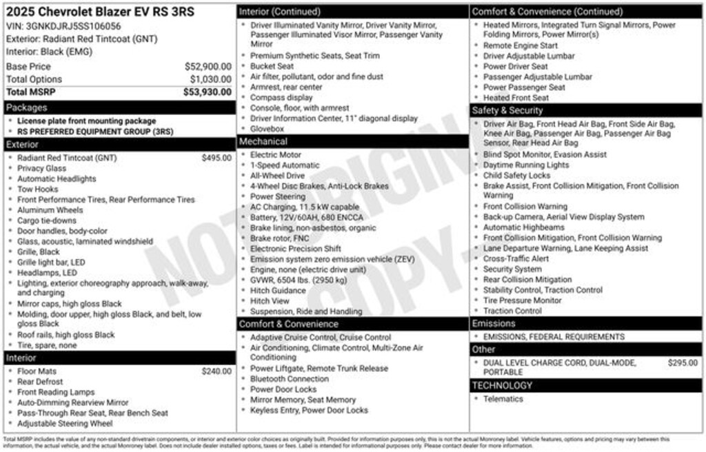 Fox Chevrolet has been delivering on a promise since 1967. Come in and check out what the Fox Advantage truly is. Same Vehicle, Same Color, Same Options- Better Value. We do the legwork for you! We use state-of-the-art software to make sure our vehicles are priced below the market. This ensures you a great value, a stress-free and fun buying experience. As part of the Fox family, all of our customers receive a Deductible Reimbursement program that could save you thousands, just ask us how! AWD 2025 Chevrolet Blazer EV RS Electric Motor