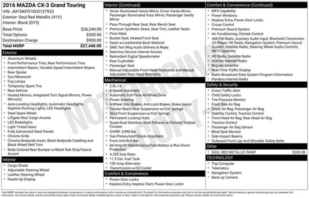 Fox Chevrolet has been delivering on a promise since 1967. Come in and check out what the Fox Advantage truly is. Same Vehicle, Same Color, Same Options- Better Value. We do the legwork for you! We use state-of-the-art software to make sure our vehicles are priced below the market. This ensures you a great value, a stress-free and fun buying experience. As part of the Fox family, all of our customers receive a Deductible Reimbursement program that could save you thousands, just ask us how! AWD 2016 Mazda CX-3 Grand Touring SKYACTIV®-G 2.0L 4-Cylinder DOHC 16V